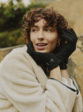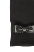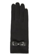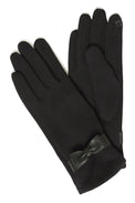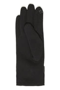Gant uni. Petite fleur brodée au bout de l'index. Boucle en cuirette au niveau du poignet. Tissu extensible avec doublure en molleton.