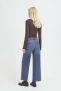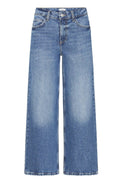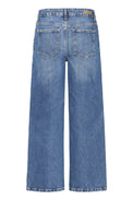 Jeans à jambes larges.  Taille régulière avec bouton et ganses. Coupe «crop». Surpiqûres de couleur beige. Denim extensible délavé au niveau des cuisses devant et derrière.