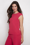 Top sans manches. Encolure évasée avec bouton et ouverture derrière. Coupe ample. Large bordure au bas. Fente sur les côtés. Tissu soyeux légèrement extensible.