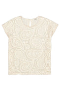 Chandail à manches cap. Encolure ronde au contour perlé. Coupe ample et droite. Effet double du tissu créer par une couture plus près du corps. Contour festonné de chaque côté. Crochet sur fond rappelant le filet légèrement extensible. Motif similaire au «paisley». Peut rétrécir au lavage.