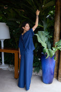 T-shirt à manches 2/4. Encolure ronde et évasée. Coupe ample et droite. Ouverture complète au dos avec bandes de tissu à nouer. Tissu léger à effet mélangé non-extensible.