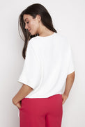 Chandail à manches 2/4 à large bordure de style chauve-souris. Encolure évasée. Coupe ample. Bandes de tissu à nouer sur le côté au bas.  Tissu soyeux légèrement extensible.