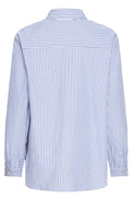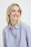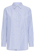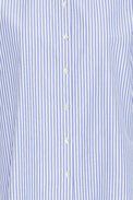 Chemisier à manches longues. Col classique. Coupe «oversize». Large bordure rayée de couleur marine sur les côtés. Boutons de style coquillage. Bas arrondi avec fente sur les côtés. Rayures verticales 3 tons. Tissu non-extensible.