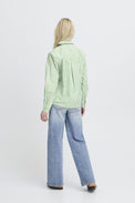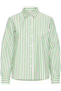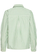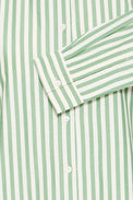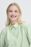 Chemisier à manches longues. Col classique. Boutons blancs. Coupe «oversize». Plus long derrière que devant. Rayures verticales 2 tons.