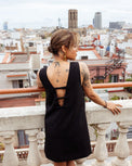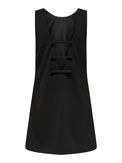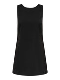 Robe courte sans manches. Encolure en «U» devant et en «V» avec petites boucles derrière. Coupe légèrement plus ample. Fermeture éclair invisible sur le côté. Tissu dense peu extensible. Jupe évasée.