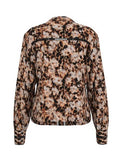 Blouse à manches longues de type ballon. Encolure ronde puis en «V». Plus longue devant que derrière. Coupe droite. Bas arrondi. Tissu en voilage plissé avec insertion de broderie noire aux bouts des manches, au contour de la boutonnière et au dos. Imprimé floral ou animal abstrait.