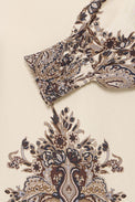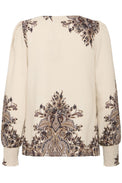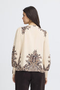 Blouse à manches longues et bouffantes. Encolure bateau. Large bande en nid d'abeille aux poignets. Insertion de motifs rappelant le «paisley» aux épaules, au bas et au bout des manches. Tissu à effet tissé non-extensible.