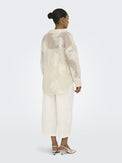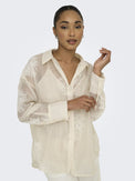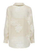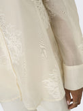 Chemisier de style tunique à manches longues. Col classique avec ouverture en «V». Coupe ample. Plus longue derrière que devant. Bas arrondi. Boutons ton sur ton. Camisole unie amovible non-extensible tenant en place grâce à des boutons-pression. Voilage transparent non-extensible offrant une légère brillance. Broderie d'inspiration florale ton sur ton.