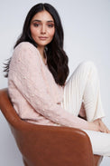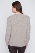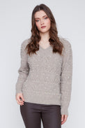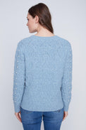 Pull à manches longues. Encolure en «V». Bordure côtelée au col, au bas et au bout des manches. Tricot ajouré en forme de losanges. Insertion de petites perles. Tricot ultra-doux et extensible.