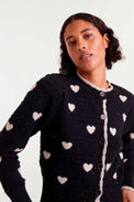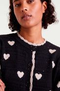 Cardigan à manches longues. Encolure ronde. Bordure côtelée avec contour festonné de couleur contrastante au col, au bas et au bout des manches. Boutons ton sur ton. Tricot doux et extensible, légèrement ajouré avec rayures verticales ton sur ton. Petits coeurs de couleur contrastante. Insertion de paillettes ton sur ton.