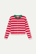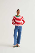 Chandail à manches longues. Encolure ronde de couleur contrastante. Bordure côtelée au bas et au bout des manches. Boutons en bois de couleur jaune. Rayures horizontales 2 tons. Tricot fin extensible.