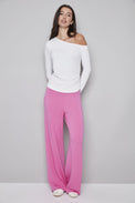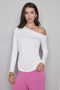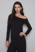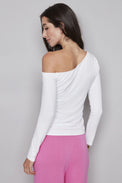Chandail à manches longues. Encolure évasée à épaule dénudée. Coupe ajustée. Effet froncé d'un côté. Tissu doux et extensible.