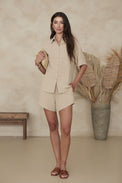 Chemisier à manches courtes. Col classique. Coupe ample. Boutons ton sur ton. Tissu extensible à effet froissé.