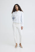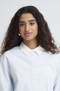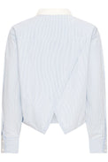 Chemisier à manches longues. Col classique uni. Coupe ample et courte.  Dos rappelant la queue-de-pie. Tissu non-extensible. Rayures verticales 2 tons.  Peut rétrécir au lavage.