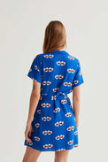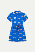 Robe courte de style chemisier. Col classique. Boutons ton sur ton. Ceinture en tissu amovible. Poches invisibles sur les côtés. Imprimé en cœurs remplis de coccinelles. Tissu à effet froissé non-extensible.