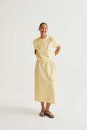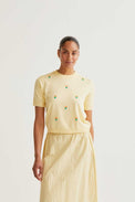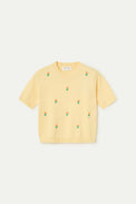 Chandail à manches courtes. Encolure ronde. Bordure côtelée au col, au bas et au bout des manches. Tricot fin très doux et extensible. Petites tulipes brodées en relief.