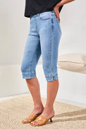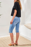 Capri de jeans à jambes étroites de type «pull-on». Taille régulière avec ganses. Surpiqûres de couleur cognac un peu plus foncées pour le jeans bleu moyen. Large bordure au bas avec fente sur le côté. Denim très extensible.
