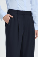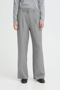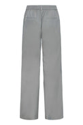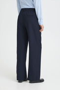 Pantalon à jambes larges. Taille régulière avec bouton à l'intérieur, agrafe et ganses. Bande élastique au dos. Poche sur les côtés. Fausses poches de ville derrière. Plis devant. Tissu non-extensible.