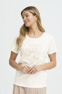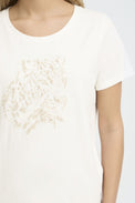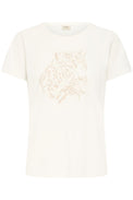 T-shirt à manches courtes. Encolure ronde et évasée. Tissu extensible. Graphique représentant un léopard au contour en broderie dont les taches sont représentés par de petites pierres, de la couleur ou de la broderie. Peut rétrécir au lavage.