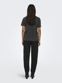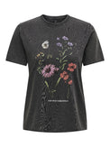 T-shirt à manches courtes. Encolure ronde avec bordure. Finition non-cousue au bas et au bout des manches. Coupe droite. Illustration de plusieurs types de fleurs colorées devant. Tissu extensible à effet délavé. Peut rétrécir au lavage.