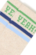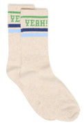 Chaussette en fin tricot. Rayures horizontales 2 ou 3 tons de couleurs contrastantes. Écriture « Très chic ou Yeah!». Tricot extensible.