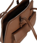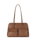 Sac à main avec compartiment zippé, détail de boucle sur les poignées, deux poches extérieures en avant et poches intérieures.