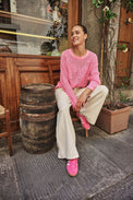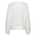 Chandail à manches longues. Encolure ronde. Bordure côtelée au col, au bas et au bout des manches.  Tricot ajouté extensible. Tricot fin superposé rappelant les gribouillis sur une feuille. Peut rétrécir au lavage.