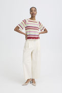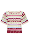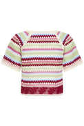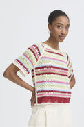 Chandail à manches courtes de type raglan. encolure évasée. Tricot légèrement extensible rappelant le cordon téléphonique. Rayures horizontales multicolores.