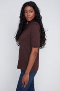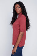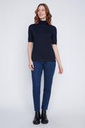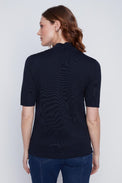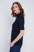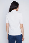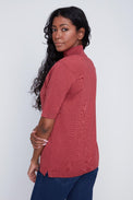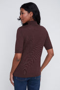 Chandail à manches 2/4. Col montant. Coupe ajustée. Tissu côtelé, doux et extensible.