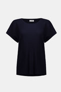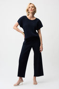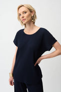 Structuré tout en légèreté, ce haut en scuba crêpe plissé présente une encolure bateau épurée, des manches dolman courtes, et des fentes latérales qui apportent aisance et fluidité à sa silhouette boxy moderne.