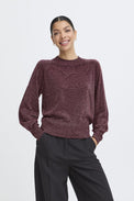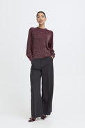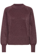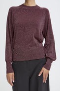 Chandail à manches longues de type raglan. Col montant. Bordure côtelée au col, au bas et au bout des manches. Coupe plus ajustée au niveau de la taille. Tricot extensible. Insertion de fils métalliques ton sur ton.
