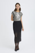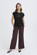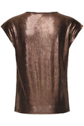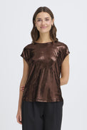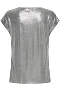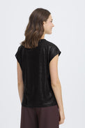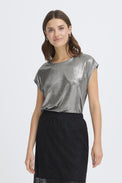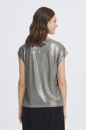 Chandail à manches cap. Encolure évasée. Coupe ample. Tissu extensible. Insertion de fils métalliques ton sur ton. Aussi disponible en rose.
