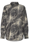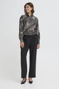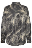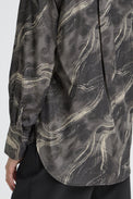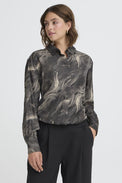 Chemisier à manches longues et bouffantes. Col classique. Bas arrondi. Plus longue derrière que devant. Tissu soyeux non-extensible. Motif à effet marbre.