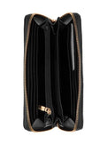 Grand portefeuille en similicuir. Quincaillerie dorée avec emblème signature sur le devant. Fermeture éclair et poche arrière zippée. Douze emplacements pour cartes. 2 poches plaquées. Dragonne de 7 pouces. 8,75 po L x 4 po H x 1,25 po P