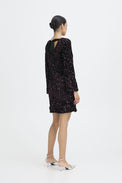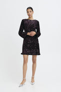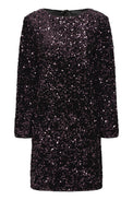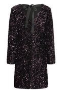 Robe à manches larges et longues. Encolure évasée avec ouverture en «V» derrière et boucle soyeuse côtelée. Insertion de paillettes dans les teintes violettes. Tissu extensible.