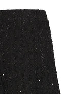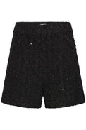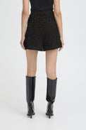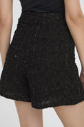 Short à fermeture éclair invisible sur le côté. Taille haute. Insertion de paillettes et de fils métalliques ton sur ton. Rayures verticales en effet «zigziag». Tissu extensible en relief.