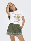 T-shirt à manches courtes. Encolure ronde. Graphique représentant des macarons ou de la glace avec insertion de petites demi-perles. Tissu très doux et extensible. Peut rétrécir au lavage. Aussi disponible aqua et blanc cassé.
