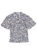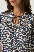 Blouse à manches tulipes. Encolure ronde puis en «V» avec lacets. Découpe arrondie au buste allant d'une épaule à l'autre. Coupe ample et évasée. Bas légèrement arrondi. Tissu offrant un fin relief. Motif animal. Peut rétrécir au lavage.