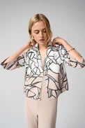 Ce blouson swing en faux suède présente un imprimé abstrait audacieux, un col cranté et des boutons-pression décoratifs. Avec des manches trois-quarts, une bande de fermeture éclair décorative sur le devant et des poches fonctionnelles, il offre un look élégant et fonctionnel.