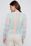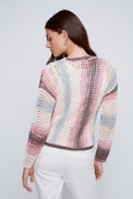 Cardigan à manches longues. Encolure en «V». Boutons à effet liège. Bordure côtelée au col, au bas et au bout des manches. Rayures multicolores en diagonales au corps et horizontales aux manches. Tricot ajouré doux et extensible.
