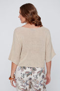 Cardigan à manches 2/4. Encolure en «V». Boutons à effet liège. Coupe ample et courte. Tricot en point de jersey extensible.