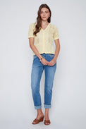 Cardigan à manches courtes. Encolure en «V». Bordure côtelée au col. Contour festonné au bas et au bout des manches. Tricot ajouré extensible en forme de «zigzag» au bas et à motif floral à l'emmanchure.