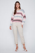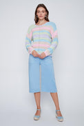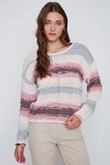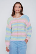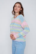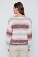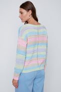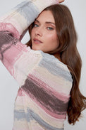 Chandail à manches longues. Encolure évasée. Rayures horizontales multicolores avec tricot offrant des rayures en relief. Bordure côtelée au bas et au bout des manches. Tricot ajouré au centre devant et aux manches. Tricot doux et extensible.