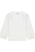 Chandail à manches 3/4. Encolure ronde. Broderie anglaise aux épaules et aux manches avec bordure donnant l'effet d'une manche raglan. Bout des manches à volant. Tissu extensible.