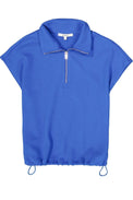 Chandail à manches cap. Col montant à fermeture éclair. Coupe ample. Élastique au bas de chaque côté permettant de cintrer. Tissu dense et extensible à effet tissé.