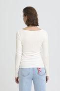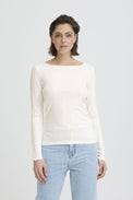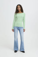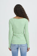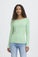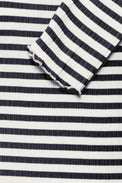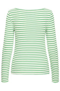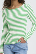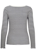 Chandail ajusté à manches longues. Encolure bateau. Tissu doux et extensible. Rayures verticales ton sur ton offrant un léger relief. Rayures horizontales 2 tons pour la couleur lime et la marine.