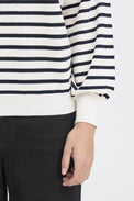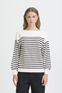 Tricot à manches longues. Encolure bateau. Bordure côtelée au col, aux épaules, au bas et au bout des manches. Tricot léger, extensible et ultra doux. Rayures horizontales 2 tons au bas.