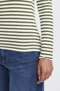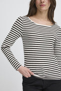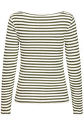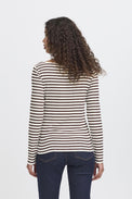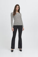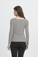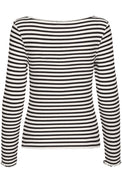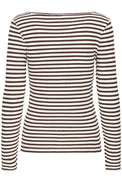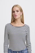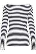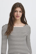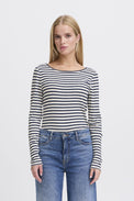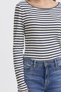 Chandail moulant à manches longues frisées au bout. Encolure ronde avec bordure. Rayures égales 2 tons. Jersey extensible avec effet de rayures dans le tissu.