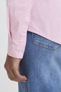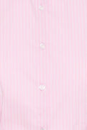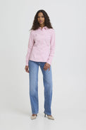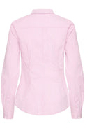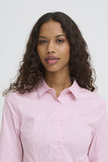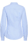 Chemisier à manches longues. Col classique. Boutons transparents. Coupe cintrée. Bas arrondi. Rayures verticales 3 tons. Tissu légèrement extensible.