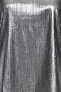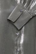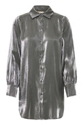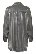 Chemisier-tunique à manches longues et bouffantes. Col classique. Bas arrondi. Fente sur les côtés au bas. Tissu soyeux non-extensible avec insertion de fils métalliques.